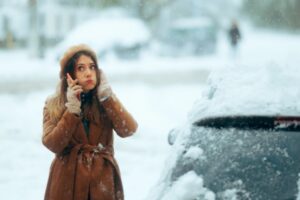 woman on the phone while stuck in snow with a broken car glass